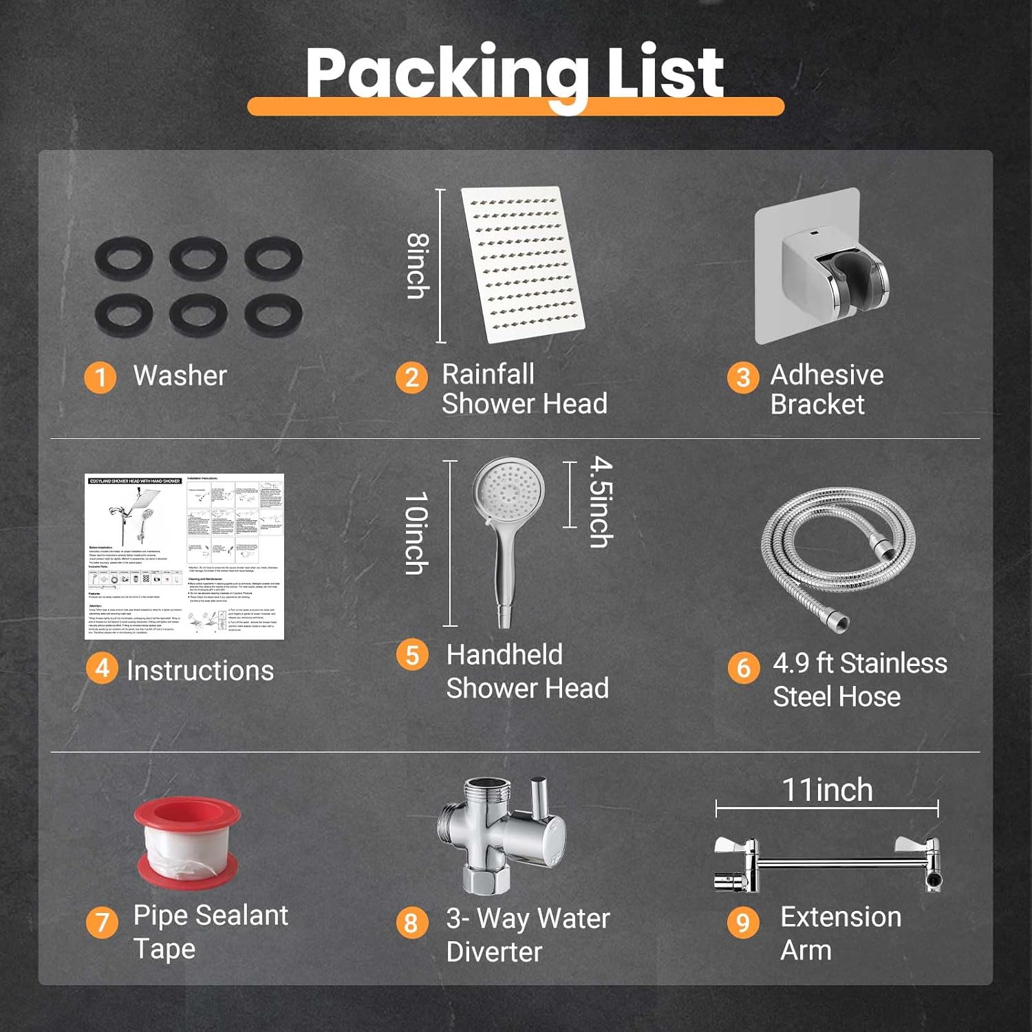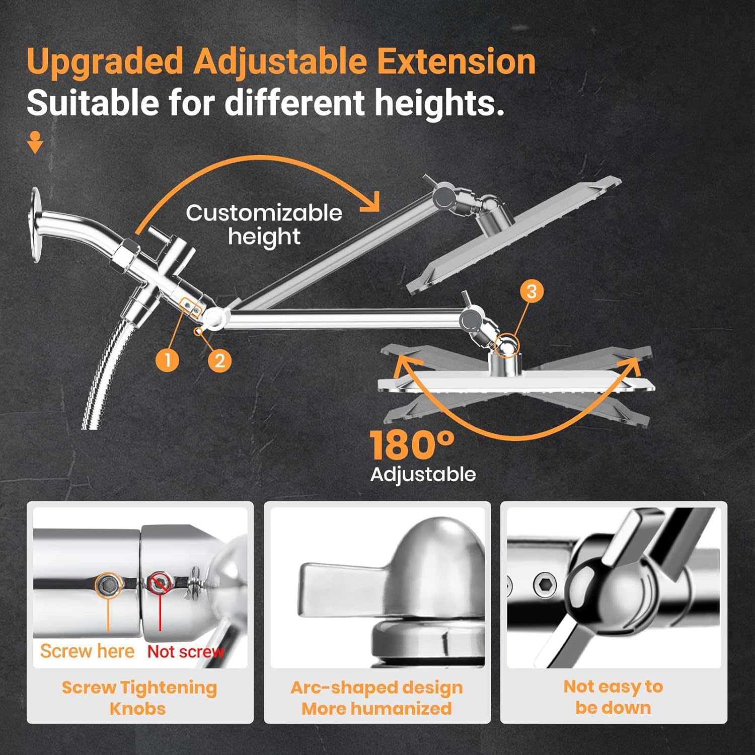 • 【11” Adjustable Extension Arm】- 11” Adjustable extension shower arm fits any shower head or hand shower. Made from solid and durable brass. Not worry about breaking or leaking. Allows you to adjust the showerhead for awesome angle and height. 2-Foot vertical movement range makes it easy to tighten the joint.