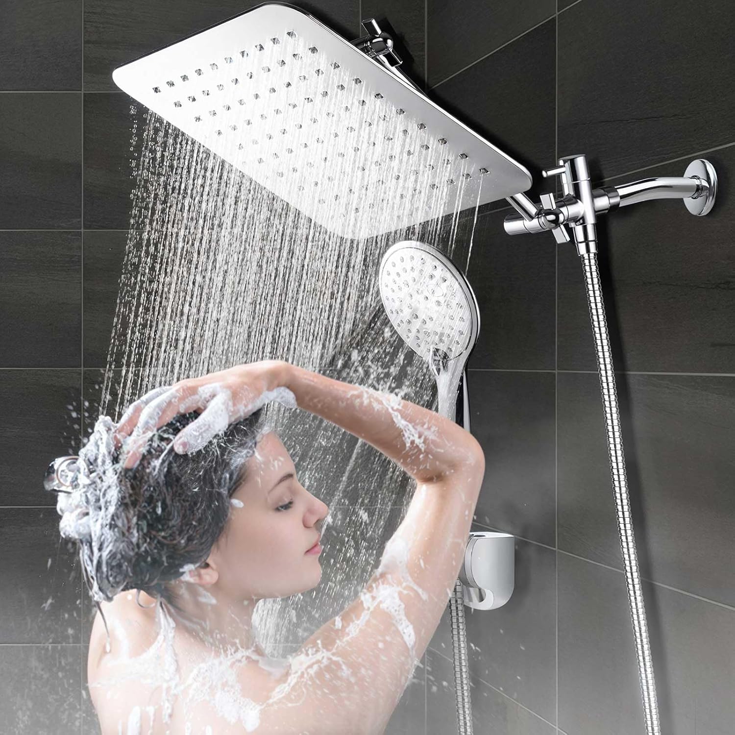 • 【10 Inches Rainfall Shower Head】-: California Compliant. Adopt TPR and high level stainless steel. Chrome Finish for the highest rust resistance and longevity. 360 rotation angle-adjustable solid ball joint nut, meets different angle position shower needs. Come with filter and washer insure reliable leak-proof connection. Using ultra-thin design and advanced air booster technology, offer superior rain spray shower experience. You can use each shower head separately or both shower heads together!