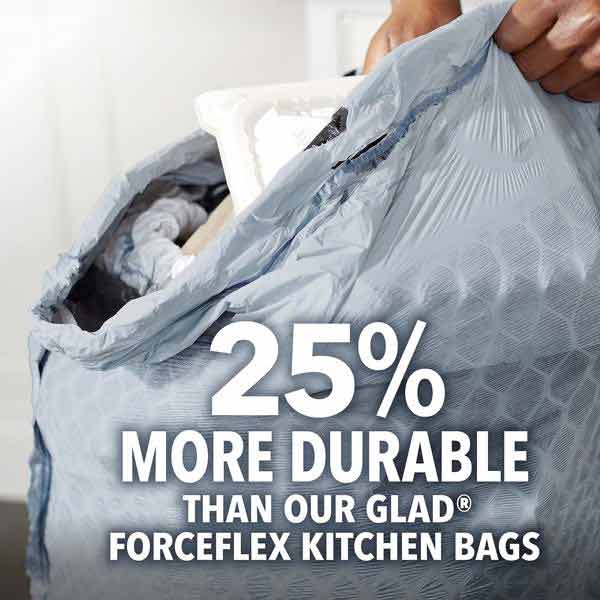 • 25% MORE DURABLE*: Glad ForceFlex MaxStrength Tall Kitchen Trash Bags are 25% more durable versus Glad 13 gallon ForceFlex tall kitchen bags; packaging may vary