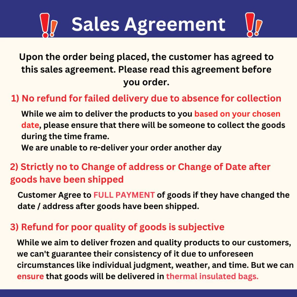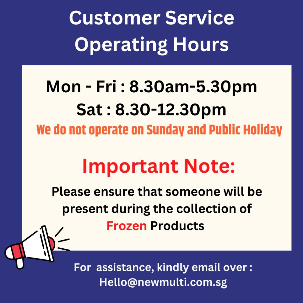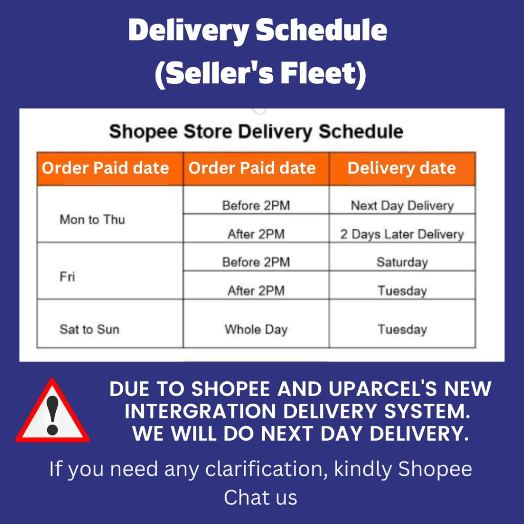 – Orders placed on a Weekday (EXCEPT Friday) after 2pm, the earliest available delivery time slots would be two days from the date of order. – No delivery to CBD/Sentosa/Shopping Malls/Remote areas. Please contact us via Shopee Chat feature for enquiries.